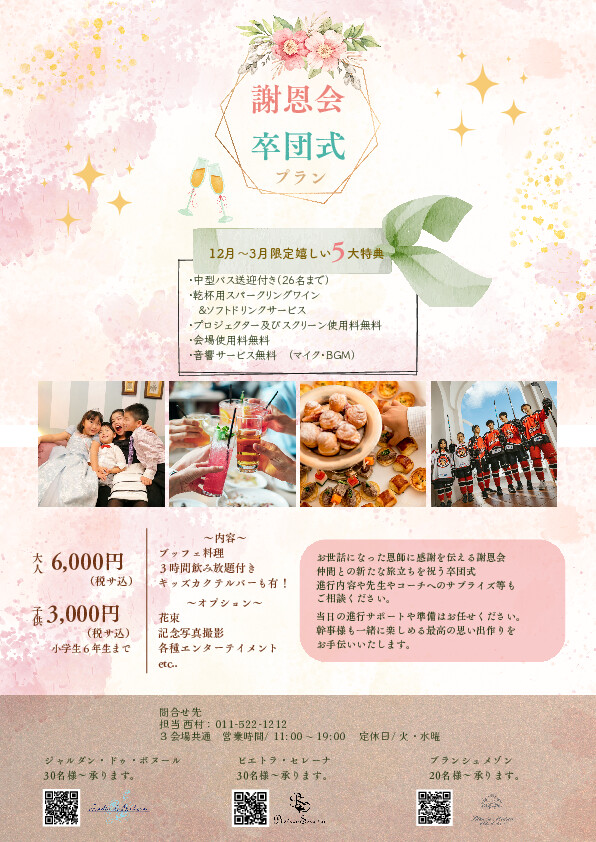 大人も子供も幹事様も全員が一緒に楽しめる最高の思い出作りをお手伝いいたします。