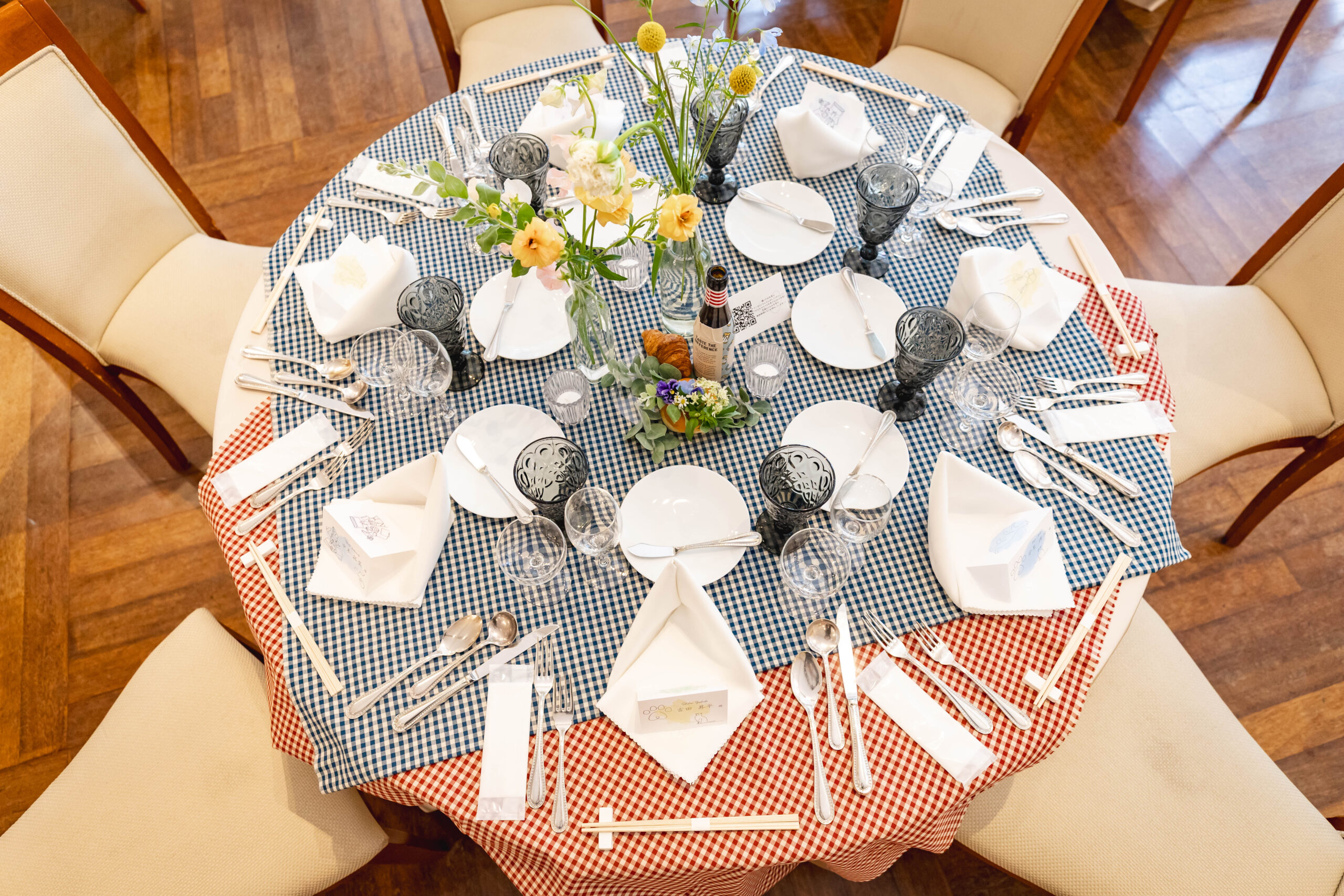 また、4月の結婚式で春っぽくもしたかったのでテーブルランナーをチェックにしたり、高砂にティピを置いていただいたり、ピクニックでビールを飲んでるような雰囲気にこだわりました。