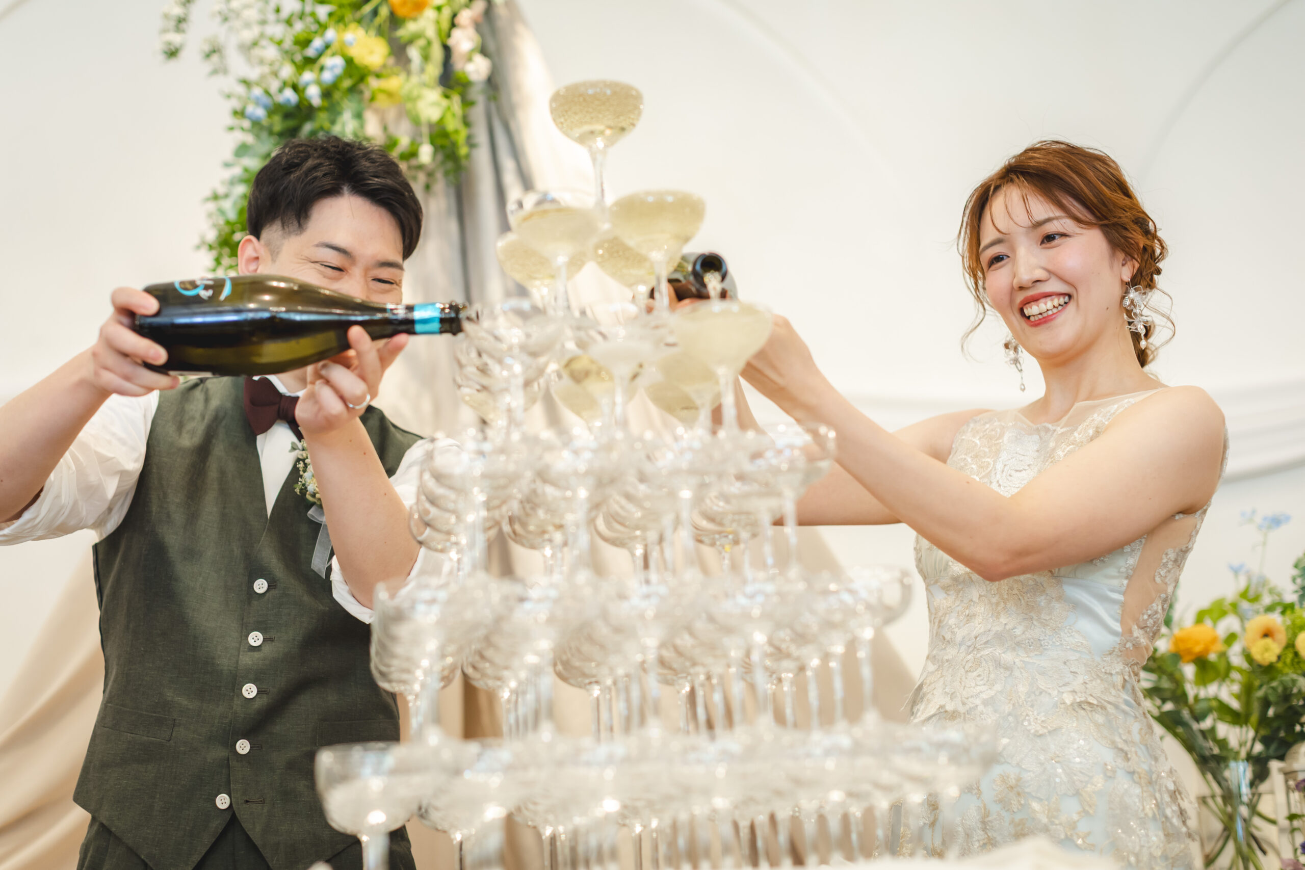 テーブルナンバーをビール瓶にしたり、初めての共同作業をシャンパンタワーにしたり