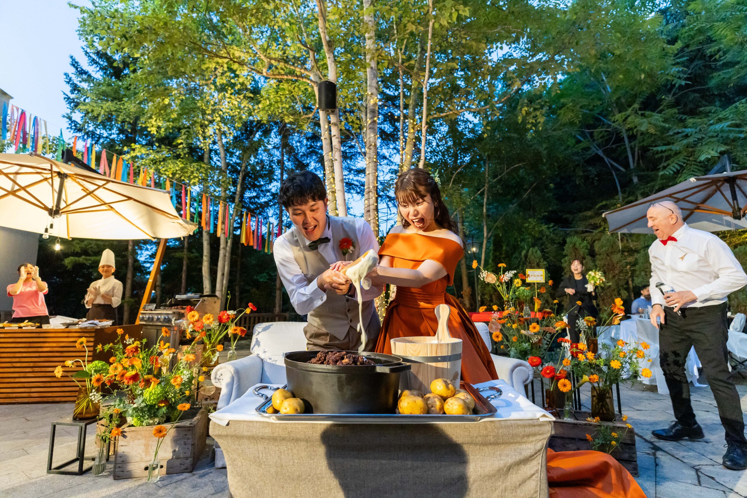 こだわったシーンは、ケーキ入刀の代わりの「黒唐揚げロウリュ」です。サウナで行う「ロウリュ」を、黒唐揚げとチーズで表現しました。プランナーさんが提案してくれてた時は、天才かと思いました。大盛り上がりでしたし、何よりその唐揚げがすごく美味しかったです!