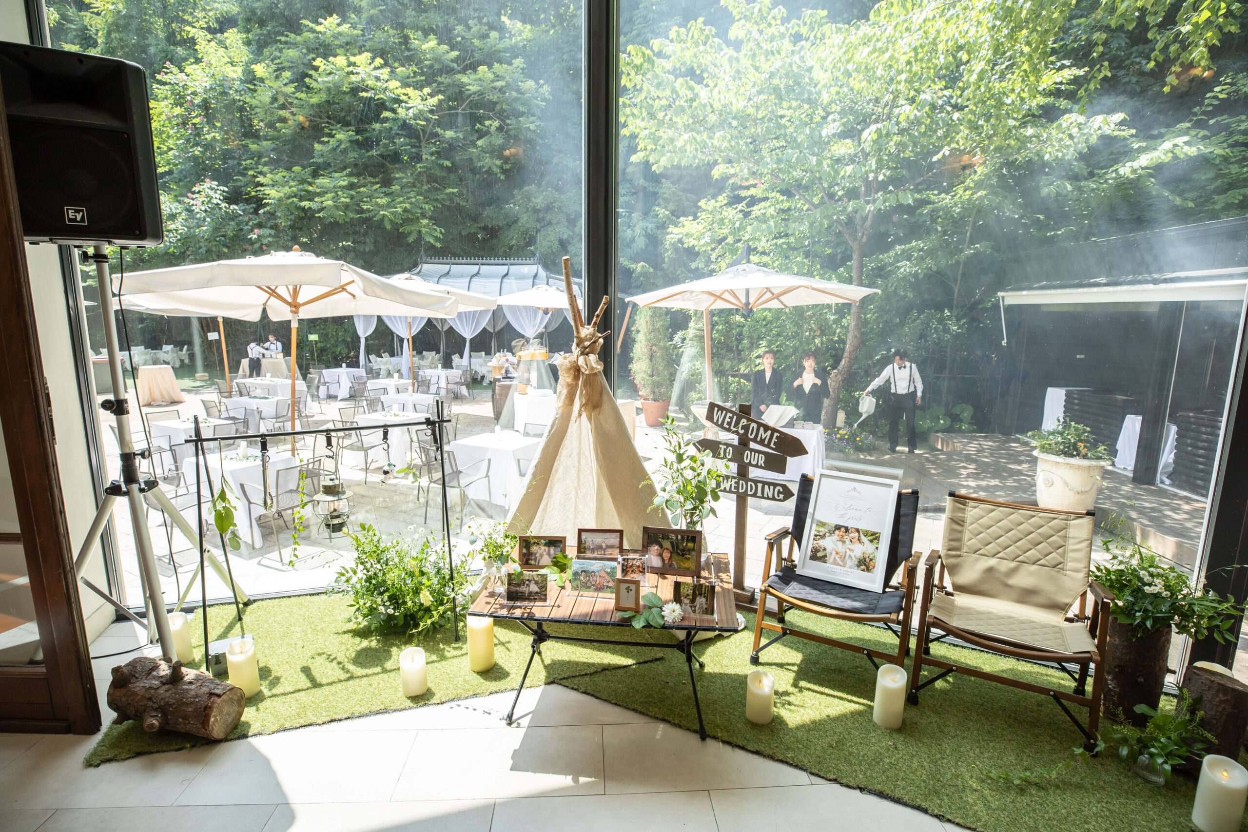 ミニテントやキャンプチェアを使ってアウトドアの雰囲気を再現しました。