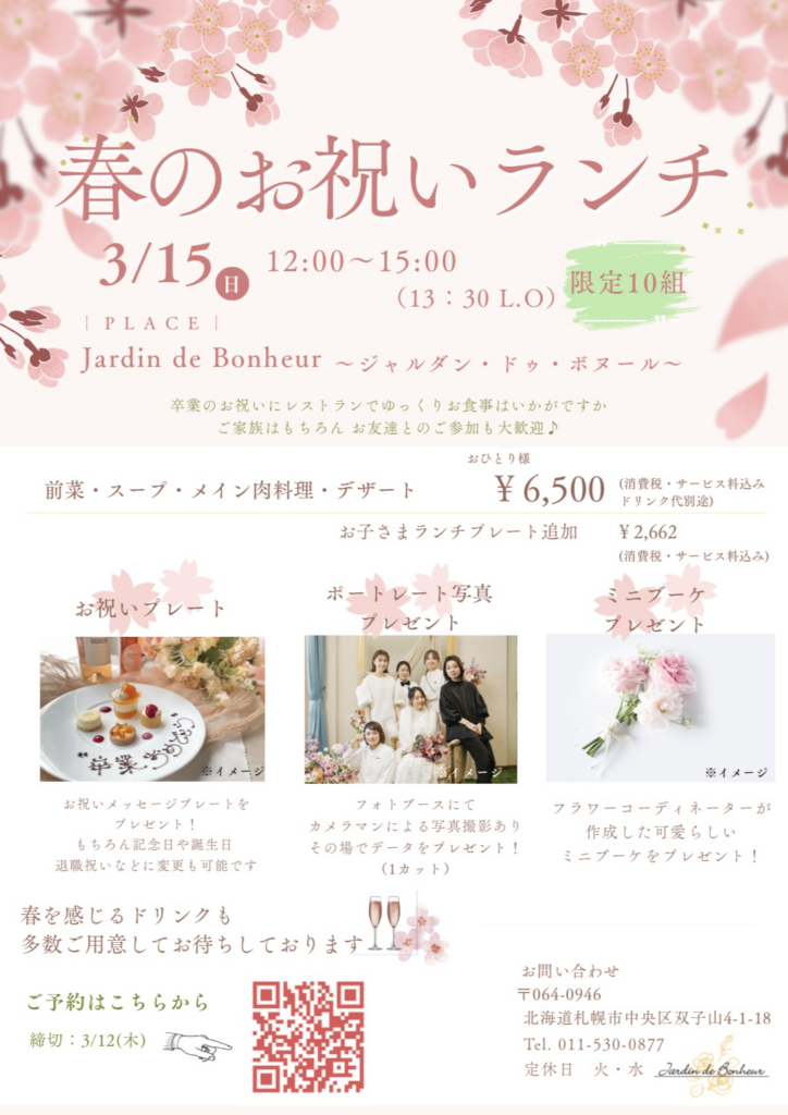 あっという間に過ぎていく毎日の中で、これまでを語り合いながら、新しい一歩を踏み出す”大切な人”にエールを送る春の時間を、ぜひジャルダン ドゥ ボヌールでお過ごしください。スタッフ一同、お待ちしております。